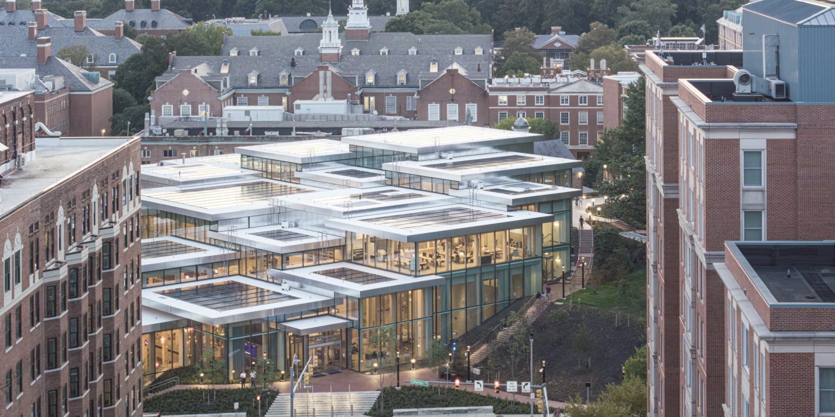 Bloomberg Student Center площадью 14 000 квадратных метров расположен в кампусе университета в Балтиморе. Архитектурный объем представляет собой серию уложенных друг на друга прямоугольных деревянных блоков со стеклянными фасадами, увенчанных плоскими крышами. В последние встроено около 1000 фотоэлектрических панелей: по словам команды, вместе они обеспечивают выработку почти половины электроэнергии в здании. Внутри павильонов разместился фуд-холл, а также общественные пространства для студентов, в том числе театральный зал на 250 мест, танцевальные студии и конференц-залы. Отделка из известняка и белого дуба визуально поддерживает деревянный каркас, в то время как теплая палитра и многослойное освещение создают ощущение уюта.