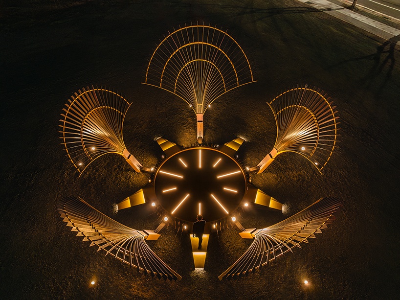 Художник из Тайваня Чэн-Цзун Фэн (Cheng-Tsung Feng) создал инсталляцию Temple: Flame Tree для локального фестиваля фонарей. Главным источником вдохновения автора стал Делоникс королевский (или огненное дерево), известный своими ярко-красными цветами. Фэн переосмыслил его характерную форму в крупномасштабной пространственной конструкции, состоящей из гнутых деревянных досок и металлического несущего каркаса. Инсталляция представляет собой пять веерообразных элементов, расположенных в пятиугольной конфигурации вокруг центральной круглой платформы, напоминая раскидистую крону огненного дерева. По задумке художника, тонкая золотистая окантовка подчеркивает структурные очертания и эффектно взаимодействует с дневным и ночным освещением. Попасть на центральную платформу можно по одной из пяти лестниц, расположенных между лепестками. Таким образом, инсталляция служит не только выразительным скульптурным объектом, но и доступной общественной средой.
