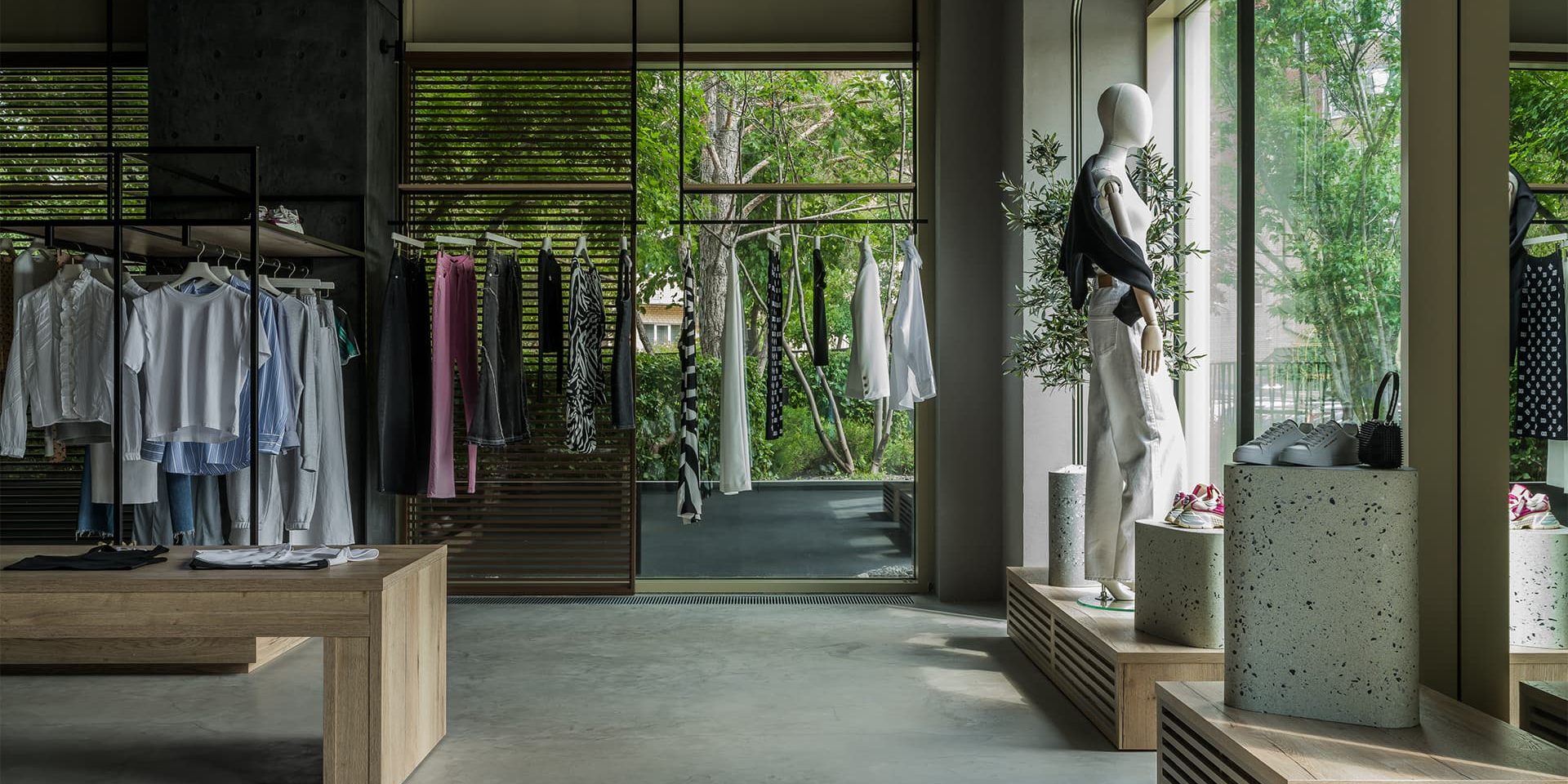 Сценарии движения в бутике выстроены вокруг островной зоны отдыха, украшенной оливковыми деревьями. Рядом с ней установили специальные тумбы, декорированные керамогранитом Cir & Serenissima с эффектом терраццо: здесь посетители смогут отдохнуть и зарядить телефоны. Зона ожидания возле примерочных обозначена декоративной скалой, которая выступает в интерьере настоящим арт-объектом. Тему камня дизайнер продолжила стойкой кассы из натурального оникса с выразительным рисунком. Для пола команда проекта выбрала нейтральный бетон, а для стен — сдержанную серую покраску. Разнообразить ее призваны потрескавшаяся штукатурка ITALICA на черных полуколоннах и панели из мятого металла на потолке. В эти детали Мария Чудинова заложила отсылки к Италии, благодаря которым оформление выглядит лаконичным и при этом глубоким. В торговом зале предусмотрены разные способы демонстрации одежды бренда, а для съемок организована профессиональная фотостудия с циклорамой. Точный светотехнический расчет и монтаж трехфазной системы освещения произвели специалисты компании Donolux. Бронзовые перегородки Respect Home подчеркивают атмосферу приватности, создают игру света и тени и добавляют пространству выразительности.