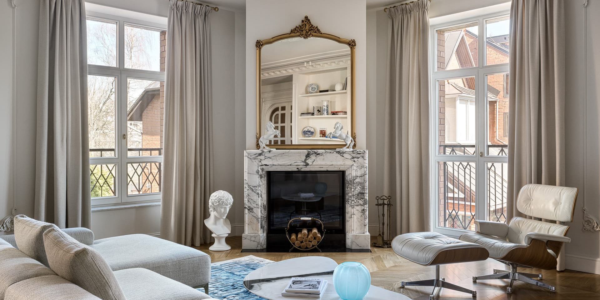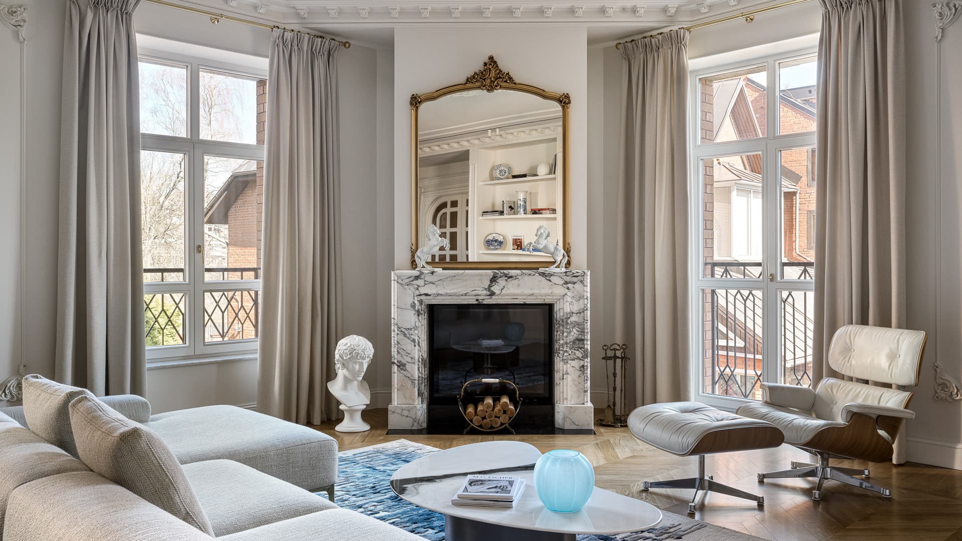 Главным недостатком объекта был расположенный в центре квартиры холл, который дизайнеры превратили в парадную проходную зону с вместительным хранением. Еще одной изюминкой проекта стала изолированная прихожая с большим шкафом для одежды и хозяйственным блоком, скрывающим стиральную и сушильную машины. Яркое колористическое решение входной зоны плавно перетекает в гостиную через распашные двустворчатые двери. Самым сложным пространством оказалась кухня — ней находились газовый котел и бризер, которые требовалось незаметно скрыть от чужих глаз без нарушения технических стандартов. Сам гарнитур команда студии Twins создавала на заказ. К реализации пришлось привлекать сразу трех подрядчиков — по камню, металлу и корпусной мебели. Торжественная мягкая группа представлена диваном из ателье Tase, креслом Vitra и ковром William Yeoward. Отправной точкой оформления выступил французский стиль, в котором старина и современность сочетаются с ощущением воздуха. Сдержанную основу цветовой гаммы Ильнура Хаматдинова, Рената Кулишова и Ирина Тихилова разнообразили золотистыми деталями и синими акцентами. Монохромный кабинет стал единственной темной комнатой. Клиент хотел получить камерное мужское пространство с кессонами на потолке — обволакивающий коричневый цвет помог воплотить его мечту в жизнь.