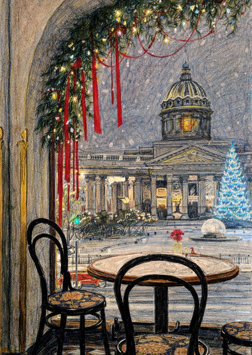 Еще включу в свой список Манежную площадь в Санкт-Петербурге: в этом году ее украсили в тематике «Щелкунчик» с теремами, катком, каруселями, блюдами из регионов России. После — обязательно зайти в французское кафе René Cafe при книжном магазине: здесь очень красиво украшены окна, а еще открывается вид на Казанский собор.