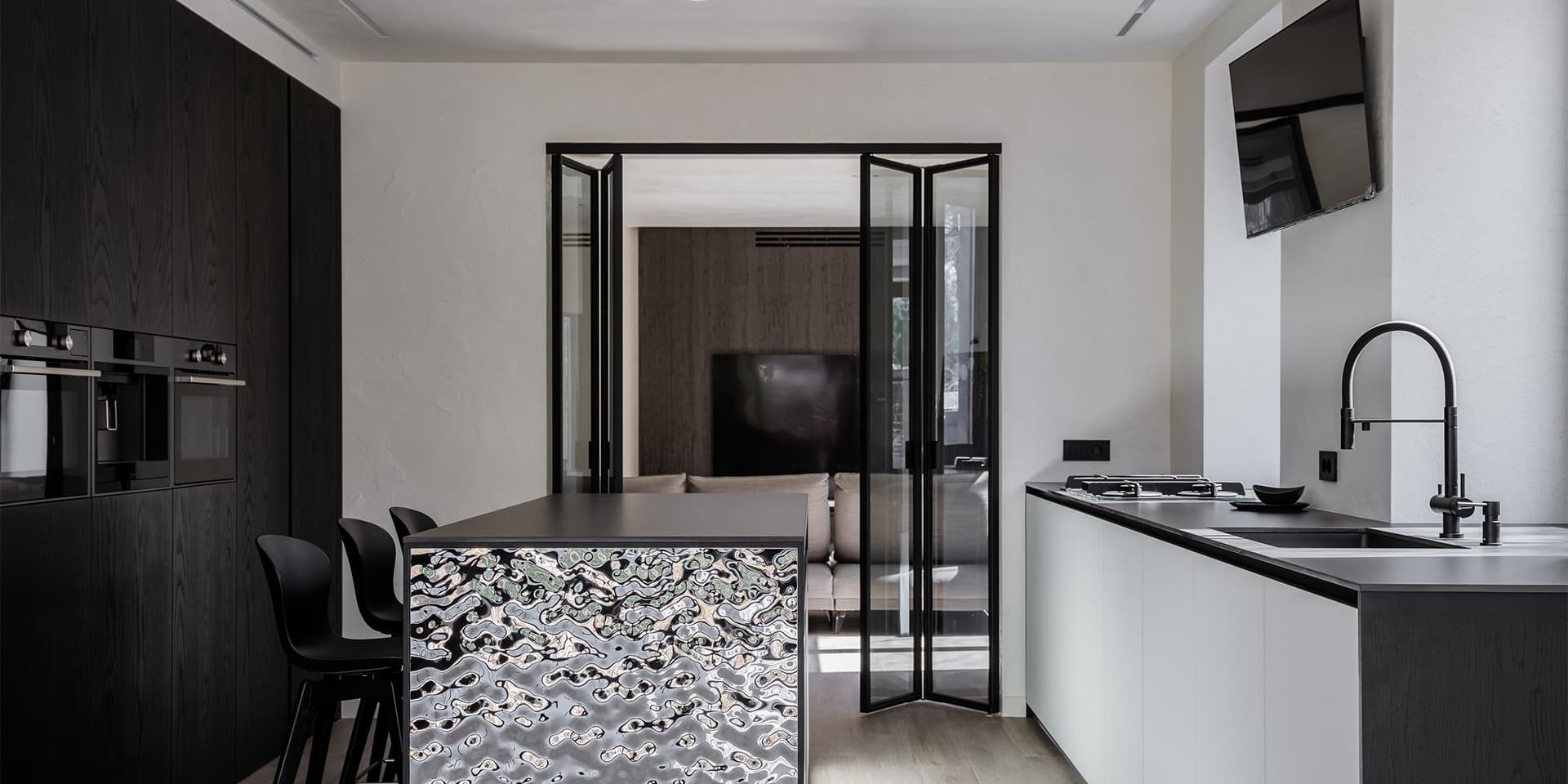 Ключевой задачей дизайнеров была проработка планировочного решения, которое помогло бы решить проблему недостатка естественного света. Масштабная перепланировка с пристройкой кухни и изменением ведущей на второй этаж лестницы смотрится особенно эффектно благодаря расширению практически всех окон. Назначение некоторых помещений изменилось в пользу более логичных и эргономичных сценариев движения. При этом в доме удалось сохранить массивный камин, разбавляющий лаконичную стилистику проекта. В общественном пространстве выделили кладовую, в которую можно попасть через фасад кухонного гарнитура. Так появился необычный монументальный объект со скрытым функционалом, а внимание от темных шкафов отвлекает отдельно стоящий остров с деталями из матового стекла. Стулья и графичные дверные проемы поддерживают общую строгость черных оконных рам. Коттедж окружен вековыми деревьями, благодаря которым природа буквально «входит» в дом, и заказчики могут наблюдать за размеренной сменой времен года. Именно таким окружением обусловлен выбор натуральных материалов — молотого камня на стенах, металла, керамогранита, шпона эвкалипта и дуба. Самым оригинальным решением интерьера оказалась перегородка между спальней и ванной — ее Юлия Истратова заменила smart-стеклом.