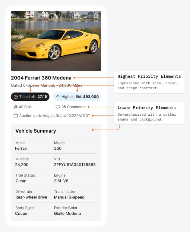 Самые важные данные на автомобильных аукционах — заголовок объявления, «Самая высокая ставка» («Highest Bid») и «Оставшееся время» («Time Left»). Поэтому в дизайне их выделяют с помощью размера, цвета и контрастной формы. Поскольку данные об «Оставшемся времени» («Time Left») обозначают наличие срочности, за счёт тёмной цветовой палитры на них делают самых сильный акцент.