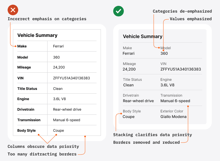 Кроме того, расположите данные в столбцы, чтобы пользователи могли чётко расставить приоритеты. Поскольку категории данных и их значения находятся близко, пользователям проще увидеть визуальный контраст.
