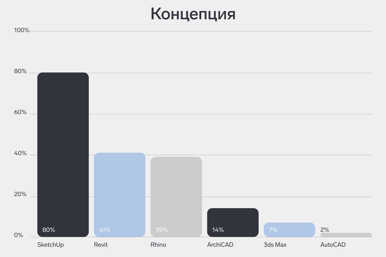 Мы не ожидали, но вторым по популярности инструментом стал Revit — на стадии эскизного моделирования им пользуется почти половина опрошенных нами архитекторов. Revit на стадии концепции часто используется скорее для апробации идей, чем для чистого поиска. Сильная сторона софта — подсчеты и квартирография уже на стадии концепции. Еще архитекторы отмечают скорость в работе с планировками, возможность в два клика поднять стены и расставить мебель. А вот другой популярный BIM-софт, ArchiCAD, для эскизного моделирования выбирают не так часто.