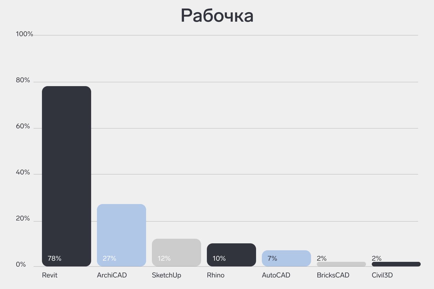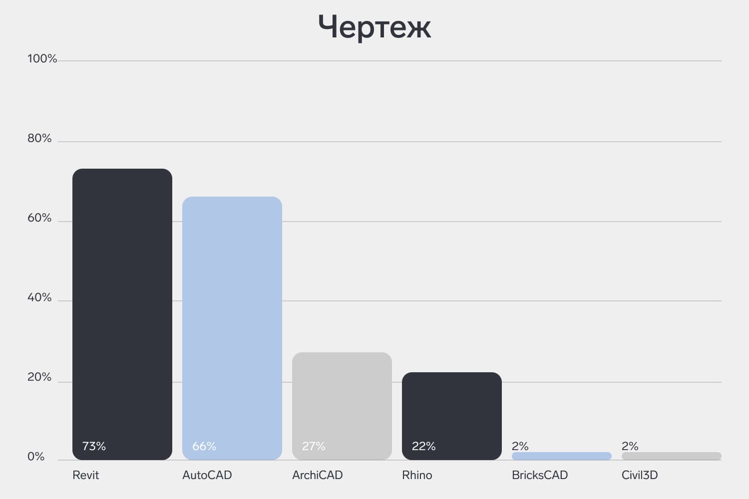 Да, нас тоже расстраивает, в каком проценте бюро все еще активно используется AutoCAD. Но не можем не радоваться — этот софт в основном появляется только как «чистый» чертежный инструмент, а его доля постепенно снижается.