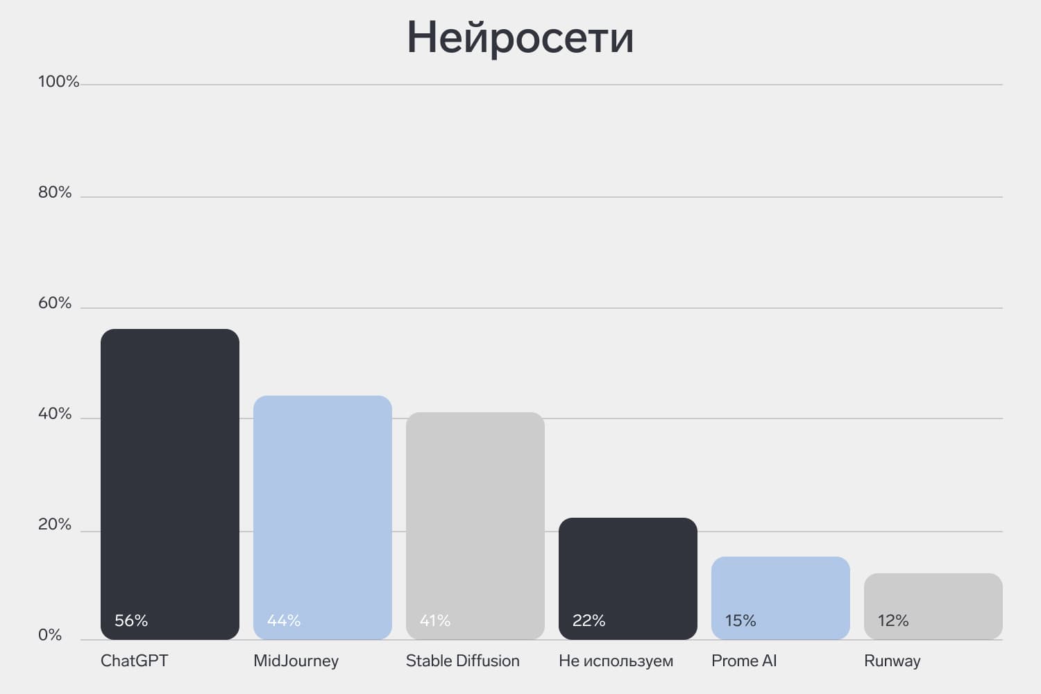 Менее популярные альтернативы — Prome AI и Runway. Часть бюро, особенно небольшие, не используют нейросети — считают их полезным, но не критичным инструментом для рабочего процесса. Раньше нейросетями пользовались для вдохновения, теперь — для конкретных задач: генерации рендеров, обработки изображений, визуального ресерча и автоматизации.