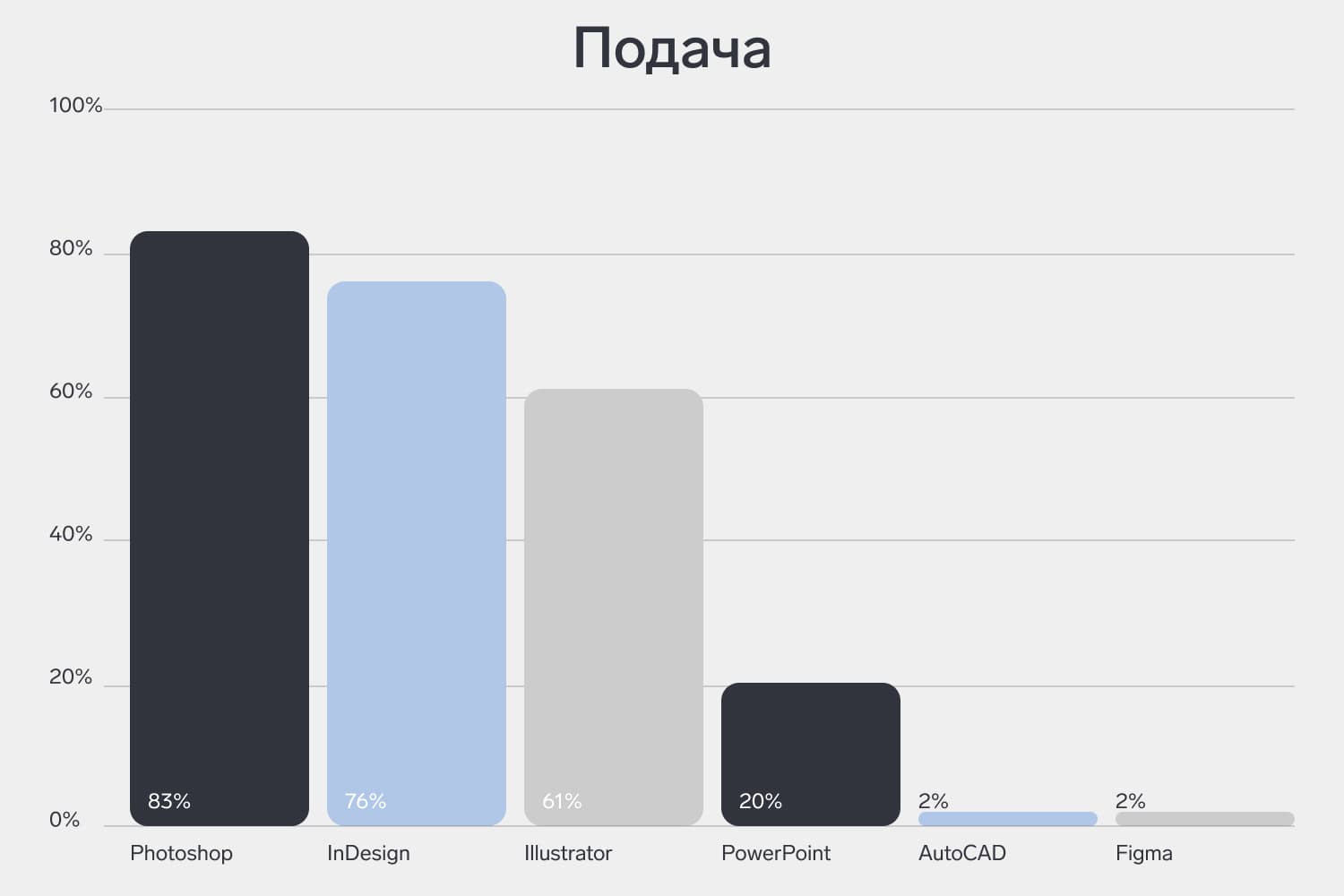 Для подачи идей, оформления схем и финальных альбомов стабильно используется большая троица — Adobe Photoshop, InDesign и Illustrator. Photoshop — самый частый выбор из всех перечисленных в статье инструментов: 34 бюро используют его для коллажей, обработки рендеров и атмосферных подач. InDesign — основной инструмент для сборки многостраничных документов: презентаций, конкурсных альбомов, дипломных проектов. У него почти нет конкурентов, но в нескольких бюро предпочитают работать в Microsoft Powerpoint, Google Slides и Figma.