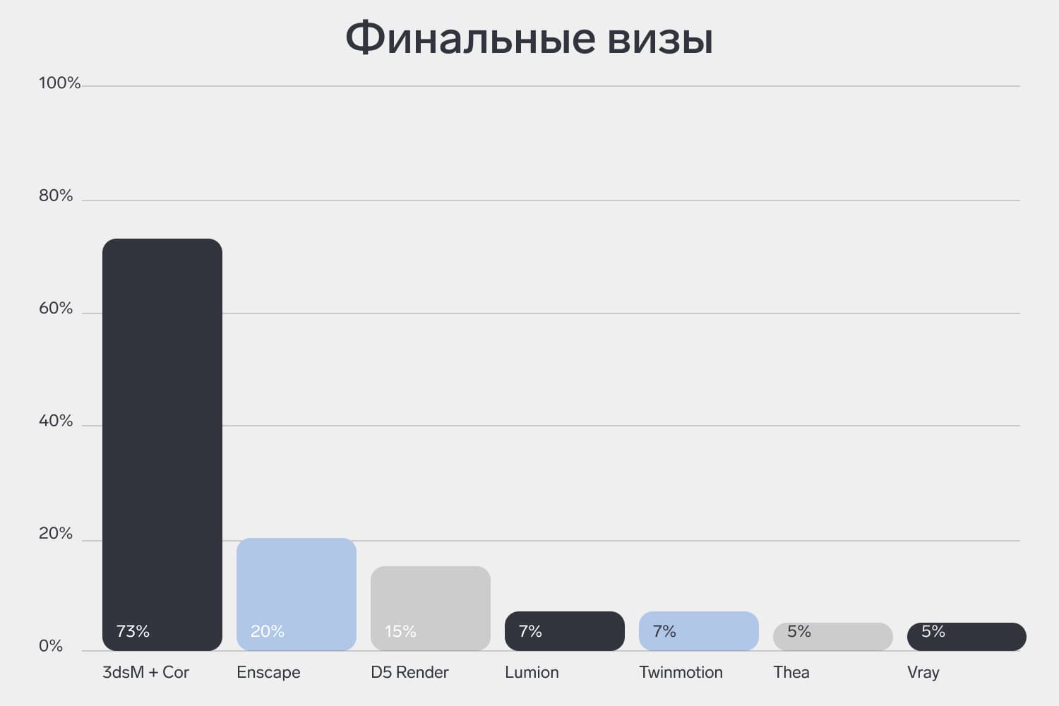 Индустриальный стандарт для финальной визуализации и подачи идей заказчику и жюри — все еще 3ds Max + Corona. Эту связку используют и внутри бюро, и при работе с визуализаторами на аутсорсе. Популярность поддерживается обширными библиотеками. А вот V-Ray сдает позиции: этот универсальный инструмент дает огромный контроль над светом и материалами и позволяет делать как реалистичную подачу, так и художественную, но его выбрали всего в двух бюро.