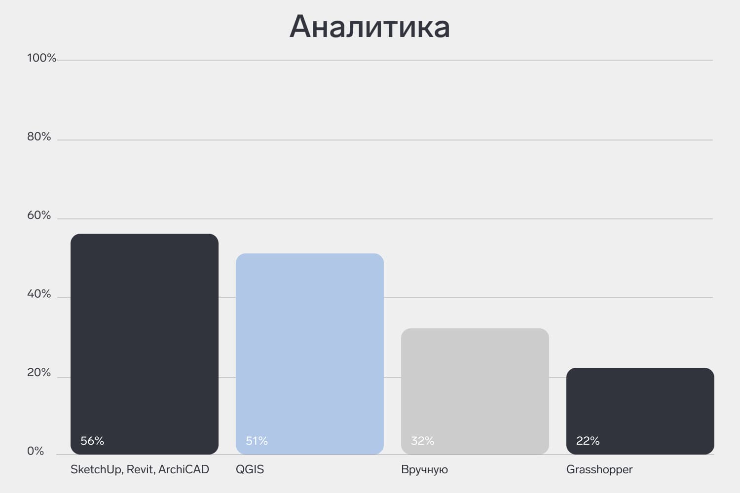 На втором месте по популярности — QGIS, самый известный софт для GIS-аналитики, им пользуется половина опрошенных нами бюро. А почти треть участников исследования делает предпроектную аналитику по старинке — руками.