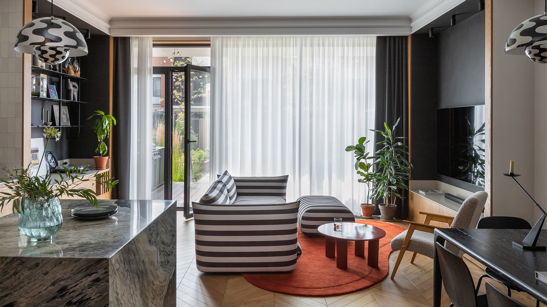 Знакомство с интерьером начинается со светлой прихожей, пол в которой уложен натуральным мрамором. Далее напольное покрытие сменяется паркетной доской с укладкой «елочкой» — единство материалов обеспечивает целостность оформления. Здесь же находятся гостевой санузел и технический узел с котельной и шкафами. Одна из створок ведет в небольшую гардеробную для сезонной одежды и обуви под лестницей. Эффектное зеркало Seletti, подаренное хозяйке на день рождения, играет роль яркой визуальной точки. Кухня-гостиная стала настоящим сердцем дома, так как здесь супруги проводят большую часть времени. Акцентом в ней выступает выполненный на заказ черно-белый диван — его окружают полученное в наследство от бабушки винтажное кресло, журнальный столик из дерева и яркий терракотовый ковер. ТВ-зона встроена в систему хранения, а симметричная ей мебельная конструкция для книг и декора установлена напротив. Кухонный гарнитур без верхних секций создает ощущение простора и воздуха за счет покрытого серой плиткой фартука в потолок. Украшением места для готовки служит остров с фасадами из темно-серого камня. Для детей дизайнера предусмотрены собственные комнаты, спроектированные с учетом пожеланий маленьких владельцев. Дочь хотела видеть растения и свой любимый оттенок фиолетового, а сын — голубой цвет и декоративных рыбок. Ванная, наоборот, получилась универсальной: ее дополнила плитка Fossil с причудливым графичным рисунком. Изюминкой мастер-спальни оказалась кровать с деревянными ножками в форме шаров: ее заказали сразу после покупки коттеджа.