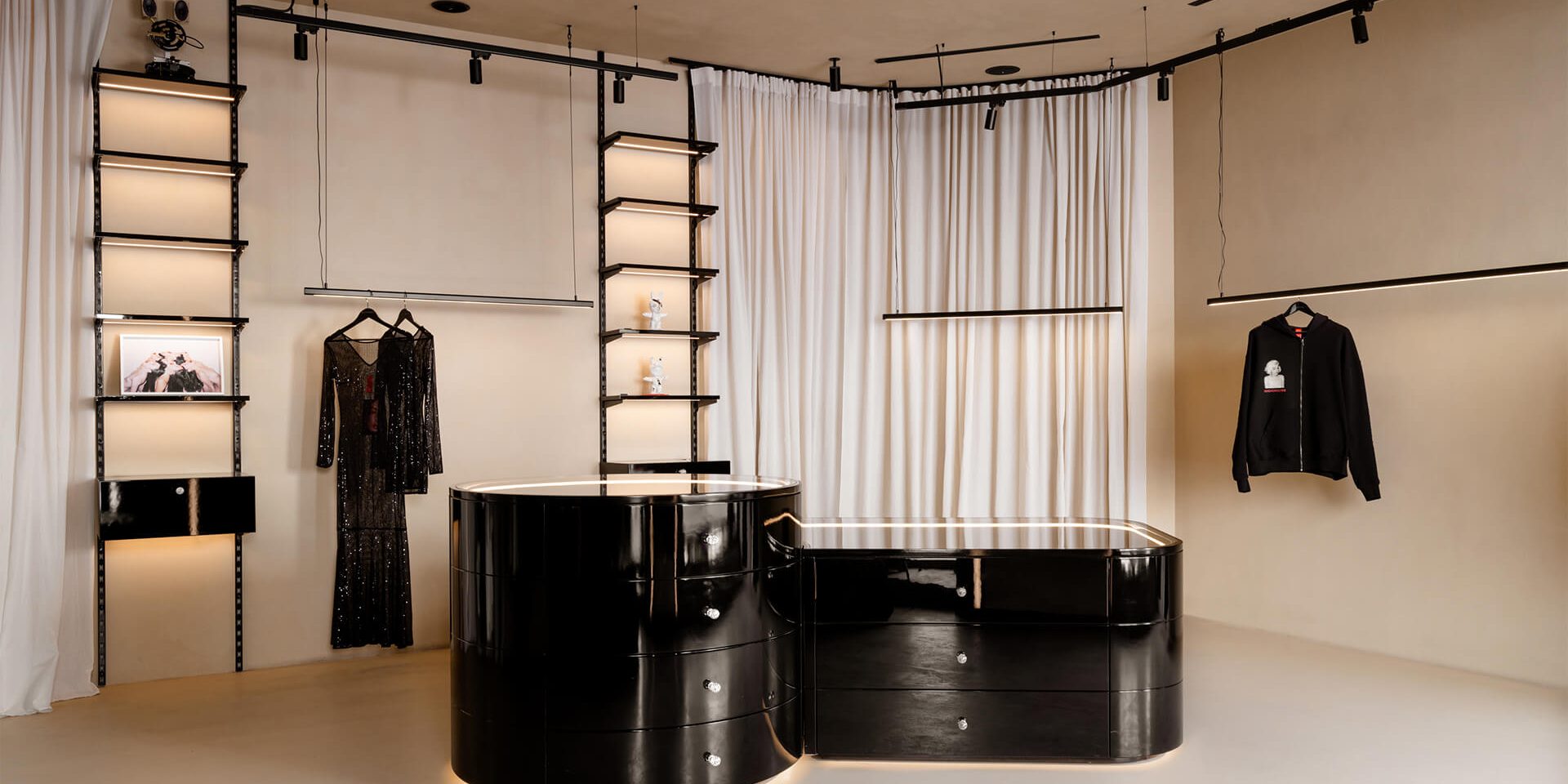 Объект попал в руки команды абсолютно пустым: на небольшом метраже требовалось разместить санузел, склад, примерочную и демонстрационный зал. Для основательницы бренда это уже не первый опыт сотрудничества с дизайнерами, поэтому у нее было сформировано четкое понимание цветовой гаммы и материалов. Александре Бурмистровой оставалось доработать концепцию и изменить не самое приятное впечатление Алены Феликсовой от взаимодействия с другими дизайн-студиями. Все хозяйственные блоки решили вынести в глубину помещения — этот прием помог выровнять геометрию торгового зала. Бежево-карамельная палитра отделки маскирует скромные размеры пространства и размывает линию стыка стен с оштукатуренными потолками. По бокам от центральной композиции с выполненными на заказ тумбами дизайнер расположила подвесные рейлы для одежды в глубоком черном цвете. Их оттенок дублирует покраску глянцевых лакированных стоек с подсветкой и встроенным хранением. Ритм графичных вертикалей продолжают строгие стеллажи и световые профили. Сделать шоурум более функциональным позволили высокие зеркала — их можно найти не только в общей зоне, но и в примерочных. Атмосферу последних подчеркнули летящие текстильные полотна.