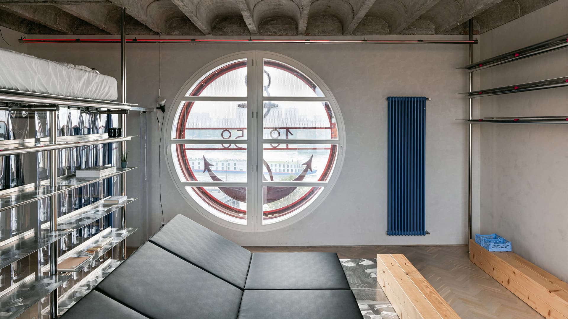 Чаще всего при небольшом метраже дизайнеры стараются максимально освободить пространство, чтобы впустить в него больше естественного света и ощущение воздуха. Однако команда Alan Prekop Studio пошла иным путем: примерно треть основного помещения занимает выполненная на заказ стальная конструкция. Она позволила более эффективно организовать ключевые функции, которые требовались для преобразования офиса в жилое пространство. Чтобы не тратить драгоценные квадратные метры на спальное место, его вынесли под потолок, куда ведет подвижная лестница. Под импровизированной постелью расположена система с открытыми полками и ящиками на направляющих. Визуально отделить их от «гостиной» решили только прозрачными целлофановыми полосками. Вместо дивана здесь появилась авторская система из шести наклонных сегментов, которая превращает гостевую кровать в модульное сиденье. Сэкономить площадь команде помогла многофункциональная прихожая, которая также служит кухней. От верхних секций здесь отказались, так как хранение кухонной утвари удалось вынести в еще один стеллаж из нержавеющей стали. Повторяющаяся палитра материалов объединяет эту вытянутую комнату с главным залом. Покрытие из переработанного пластика используется на всех поверхностях, от полов до шкафов и столешницы. Единственными вкраплениями цвета в проекте выступили ярко-розовые соединители, напечатанные на 3D-принтере.