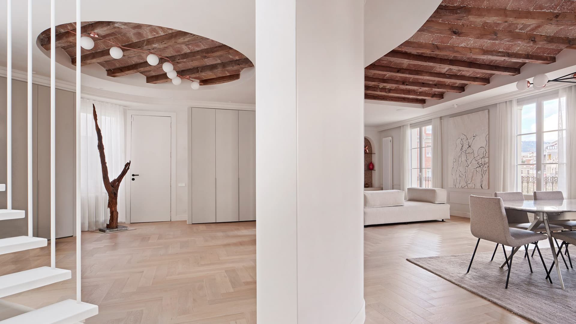 Новая планировка дома закручивается из воображаемого центрального ядра, которое служит фокусной точкой интерьера. Прежде всего команда демонтировала лишние перегородки и морально устаревшую отделку. Для создания контраста с терракотово-красной кладкой потолочных перекрытий дизайнеры выбрали мягкую бежевую палитру. За счет сдержанной монохромной гаммы акцентные детали становятся самостоятельными элементами оформления. Кроме того, этот прием позволил усилить присутствие естественного света в пространстве. Единственное вкрапление цвета встречается в санузле: здесь команда студии восстановила традиционную плитку, формирующую визуальный диалог с лаконичным покрытием стен. Неожиданный выход за пределы контура квартиры появился благодаря лестнице — световой люк у ее окончания ведет на террасу. Яркие фрагменты несущих конструкций заметны во всех ключевых помещениях, от объединенной с холлом гостиной до кухни с характерными глянцевыми шкафами из нержавеющей стали. Порталы между функциональными зонами здесь обрамляют тонкие молдинги и элегантная лепнина. Радиусную геометрию фасадов подчеркнули выполненные на заказ светильники греческой компании Delight.