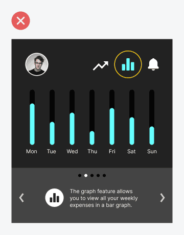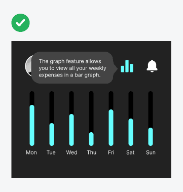 Более эффективный подход к объяснению сути функций приложения — применение всплывающих подсказок, которые появляются во время взаимодействия. Они дают информацию в момент применения функции. Это позволяет людям сразу начать её использовать без необходимости запоминать ранее предоставленные инструкции. В результате, чтобы выполнять задачи, им потребуется меньше когнитивных усилий.