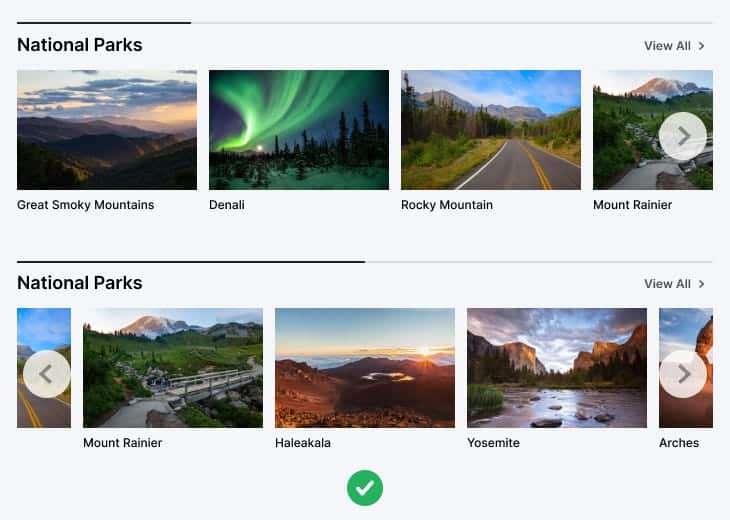 Когда вы располагаете несколько слайдеров с категориями друг под другом, разделитель прогресса выступает в роли визуального разделителя между ними. Пользователи сразу поймут, что каждый разделитель прогресса связан с элементами, расположенными под ним. Без точек макет страницы выглядит более аккуратным и упорядоченным.