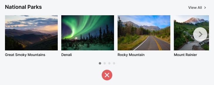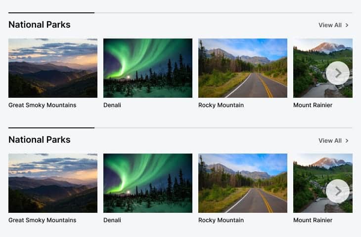 Кнопку «Показать все» (View All), как правило, сложно найти. Если пользователь не обратит внимание на правый край, он не увидит её, что часто бывает на широком экране компьютера. Разделитель прогресса делает кнопку «Показать все» более заметной, потому что она находится на одной линии с ним. По мере продвижения вправо, пользователь легко обнаружит кнопку.