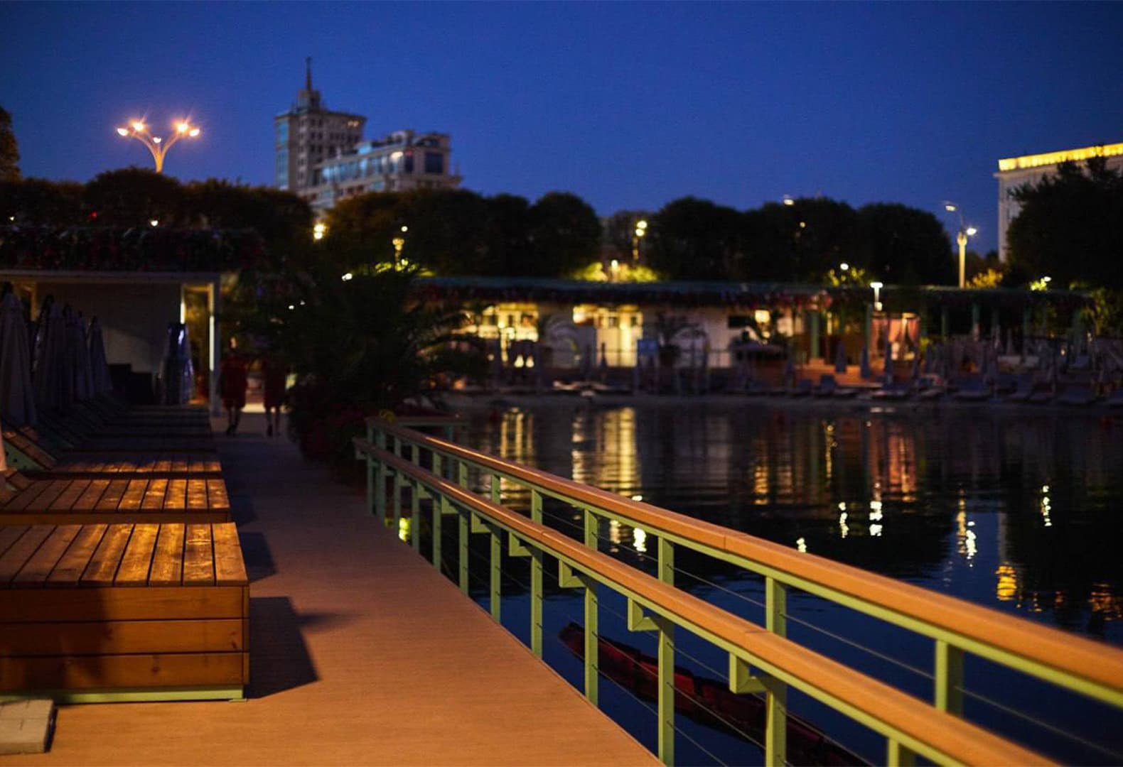 Особую роль играет вода: отражения становятся самостоятельным визуальным слоем, где световые блики, архитектура и силуэты деревьев читаются как продолжение композиции, усиливая глубину и создавая ощущение цельности среды. Вечером пространство не теряет выразительности, а становится камерным и созерцательным.