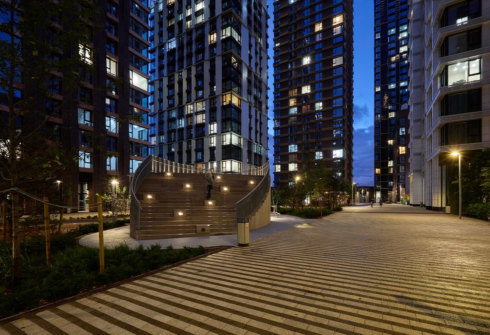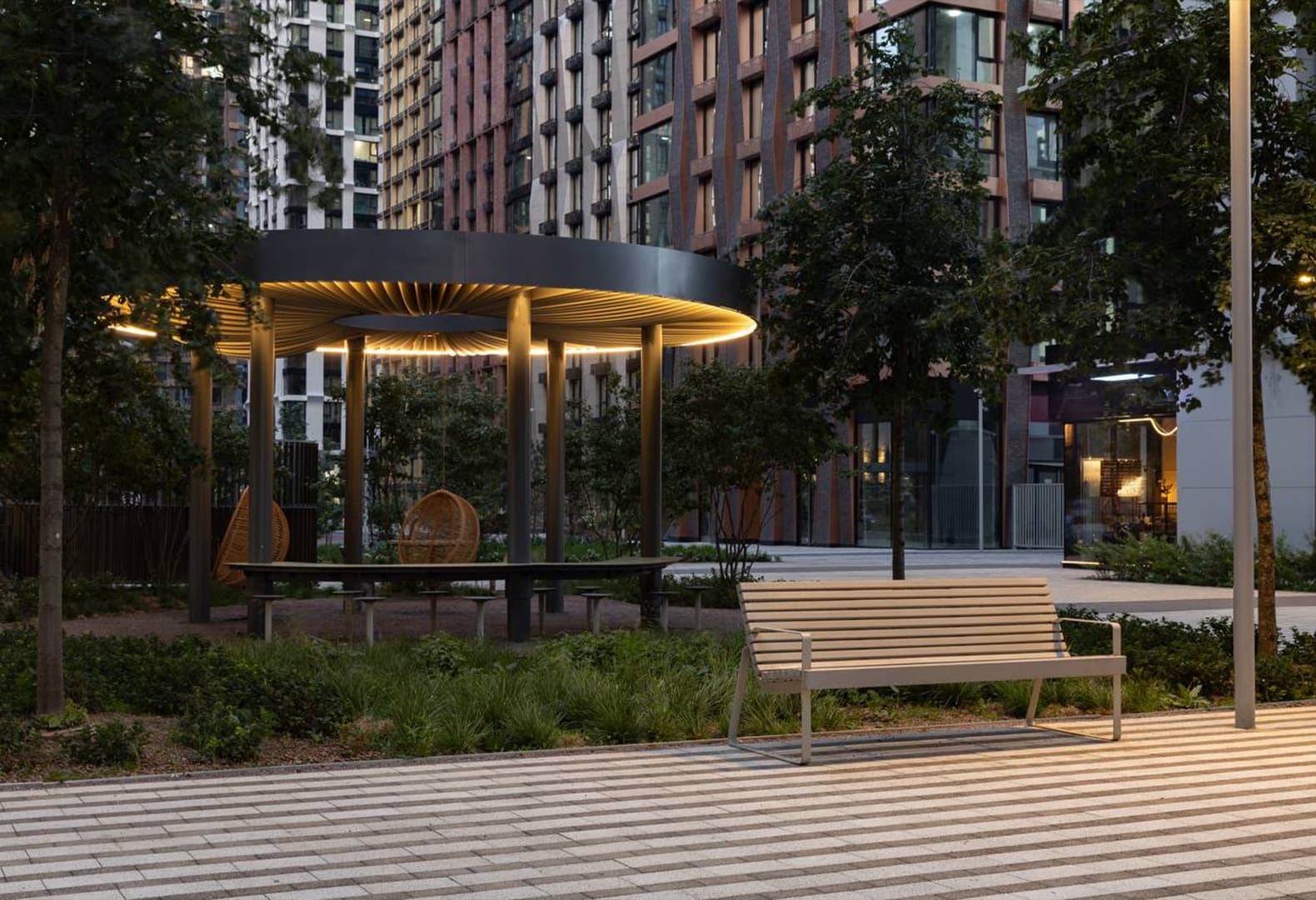 В жилых комплексах свет одновременно организует движение, выделяет входные группы и дворы, формирует приватность и комфорт, обеспечивая безопасность. Например, вторая очередь ЖК «Метрополия» по проекту бюро UTRO демонстрирует подход, где свет подчеркивает архитектурные и ландшафтные решения без лишней декоративности. Минималистичные светильники создают ровную, спокойную атмосферу, а проекции на газоне центральной поляны, имитирующие мерцание солнечных бликов, формируют визуальные акценты, читаемые с верхних этажей и на уровне двора, создавая характерную атмосферу «духа места». Тщательные расчеты освещенности и настройка приборов исключили слепящий эффект, обеспечив равномерное покрытие функциональных зон и ненавязчивые акценты на малых архитектурных формах.