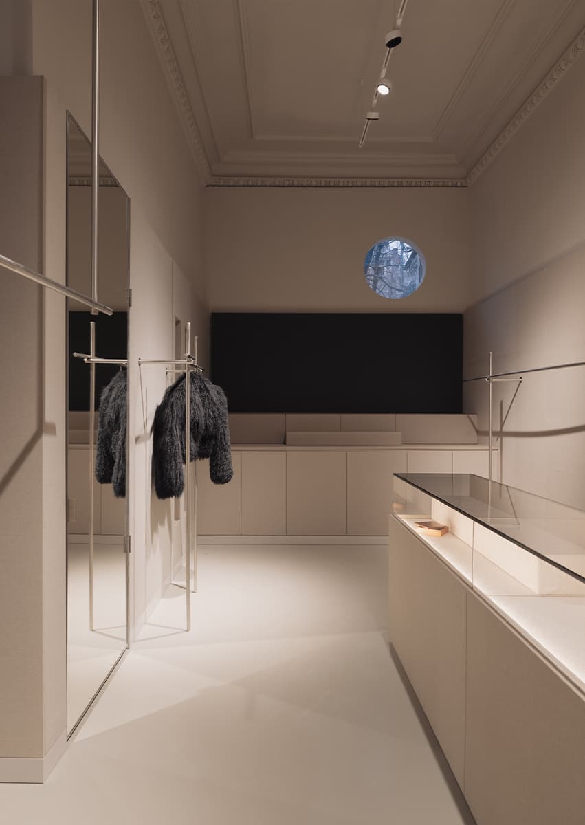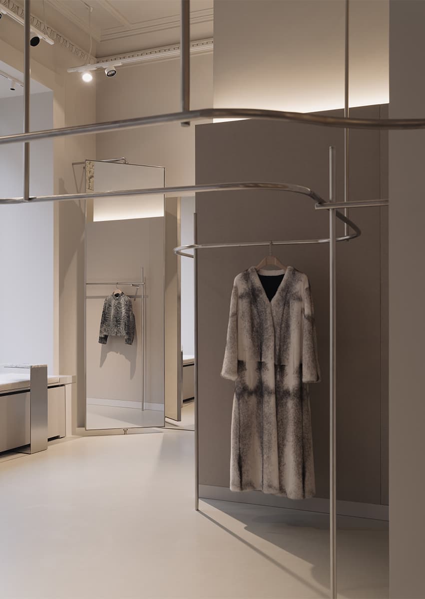 В бутике свет стал ключевым инструментом создания атмосферы сдержанной роскоши. Все сценарии выстроены в единой цветовой температуре 3500 K, выбранной после тестов с изделиями из меха разных оттенков и фактур. Холодный свет добавлял блеска и жесткости, теплый смещал оттенки в желтый спектр, тогда как нейтральная температура позволяет материалу говорить самому за себя.