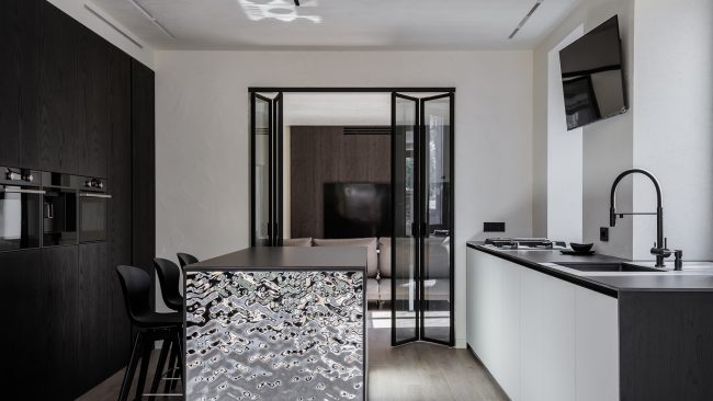 Графичные перегородки, камин и молотый камень в интерьере семейного загородного дома — проект Юлии Истратовой